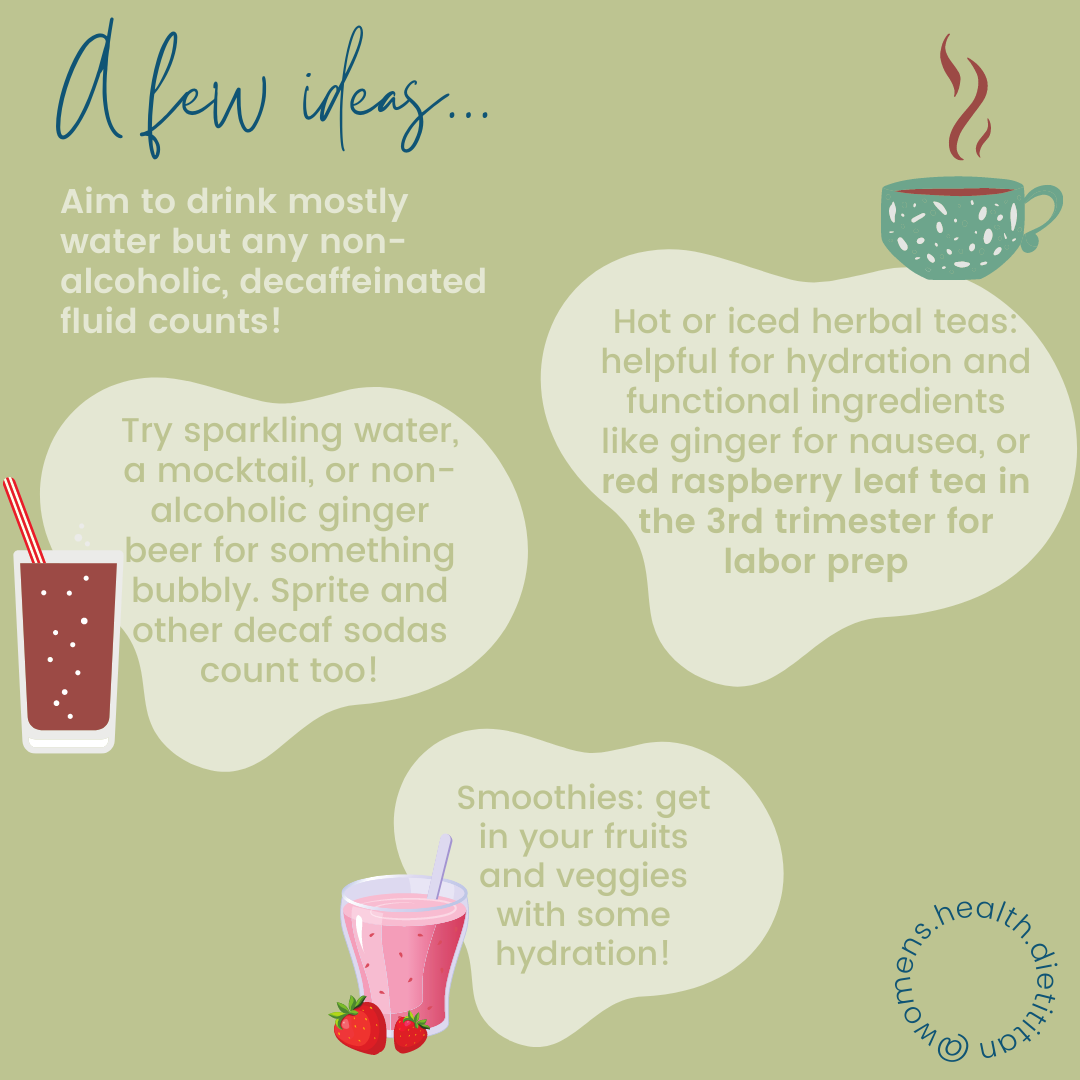 Hot or iced herbal teas are helpful for hydration, and often contain functional ingredients like ginger for nausea, or red raspberry leaf tea in the 3rd trimester for labor prep.