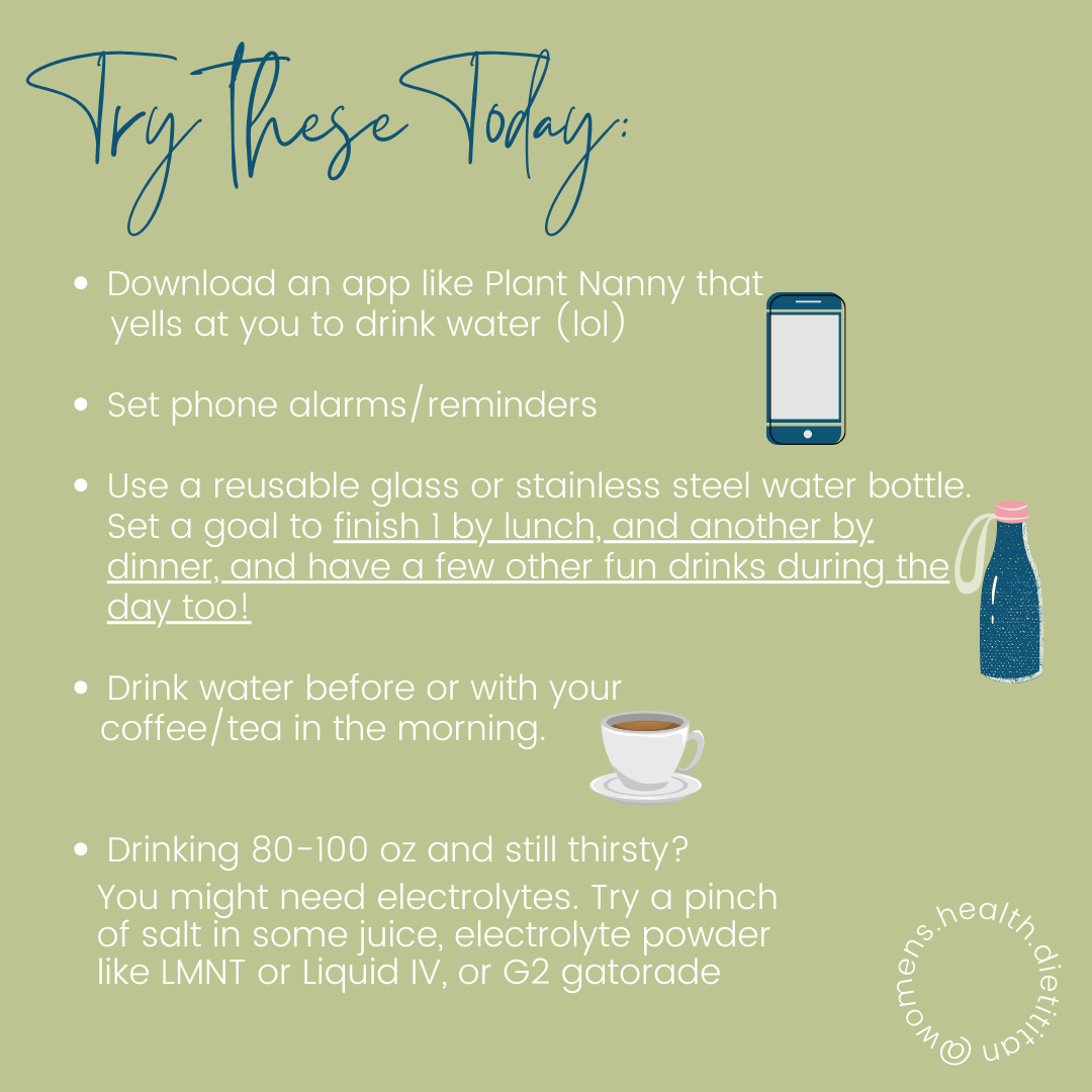 You’re probably wondering: sounds great… but, how do I get there?? Here’s a couple tips to help you set goals and remember to get in your fluids!
